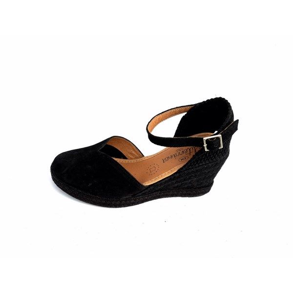 Alpargatas para mujer de la colección de Mediterránea. Alpargatas con cuña media de 8 cm con piso de 1,5 cm. Planta en piel acolchada. Suela engomada antideslizante. Cierre de hebilla al tobillo.