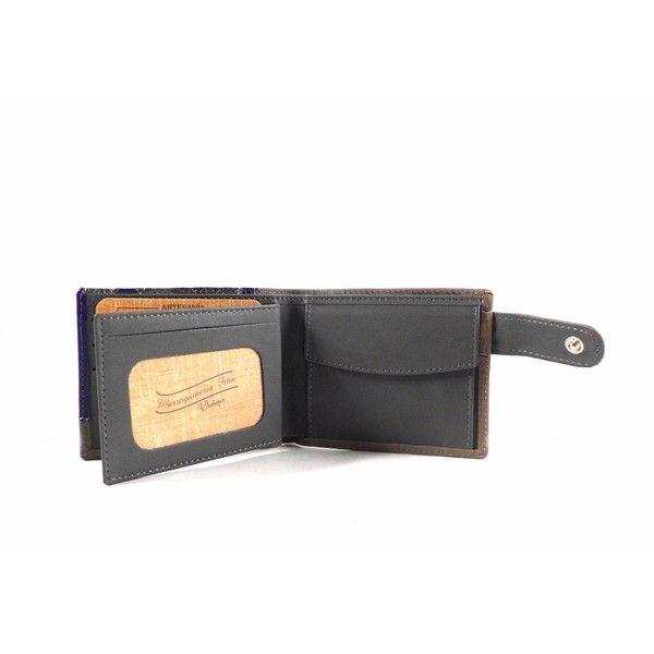 Billetera de tipo americano de la colección de Nilo. Piel vacuno hidratada y grasa. Combinación de colores única. Cierre de presilla. Monedero interior. Doble billetero con 3 tarjeteros y 2 espacios para fotos o carnets.