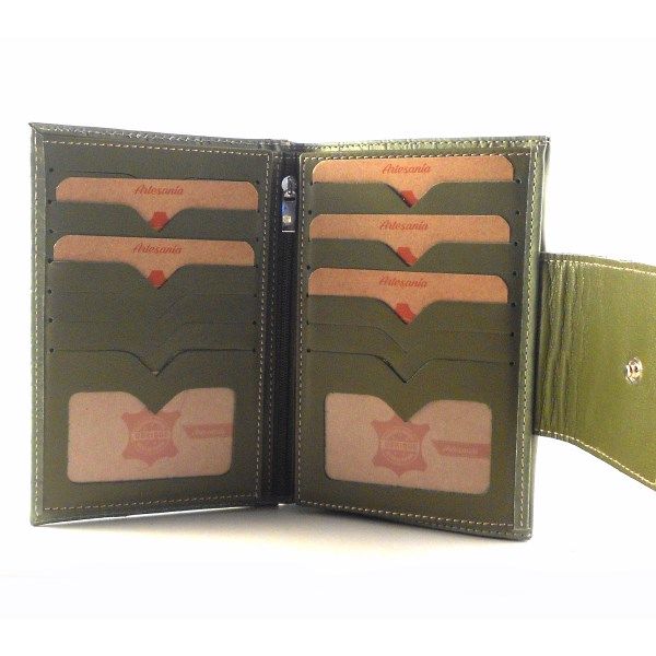 Cartera de mujer de tamaño mediana de la colección de Nilo. Billetera con 14 ranuras para tarjetas, 4 espacios de fundas transparentes, cremallera central y billetero amplio. Monedero doble separado por bolsillo con cremallera central. Piel vacuno natural hidratada, suave y flexible.