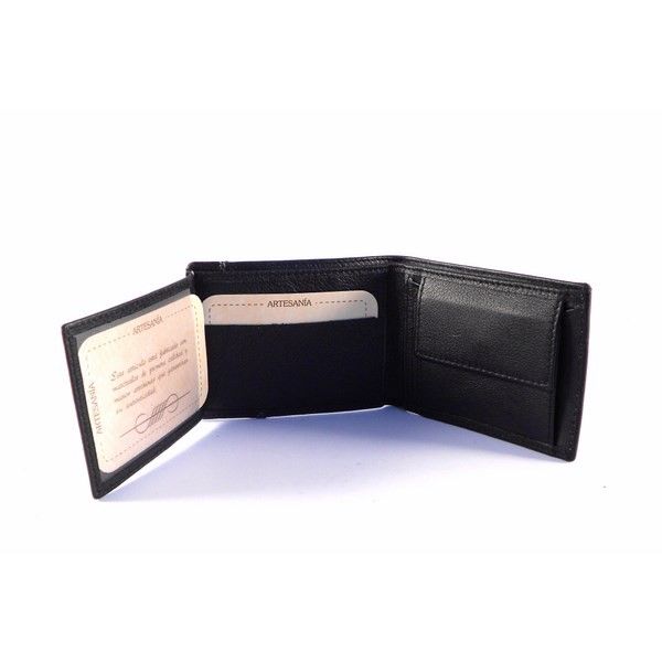 Billetero con monedero de tipo americano u horizontal en piel vacuno de primera calidad hidratada. Disponible en color marrón o en color negro. Monedero interior para monedas. 5 tarjeteros con espacio para dni y billetero. Dimensiones: 8 x 10 cm.