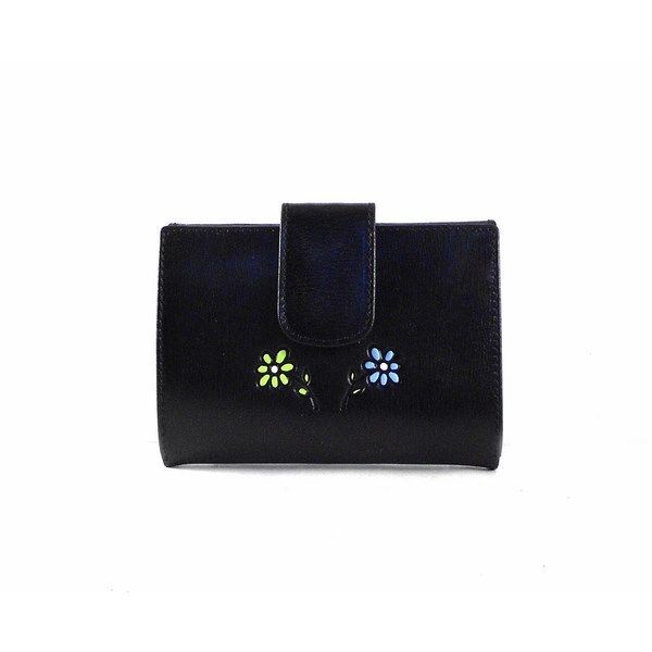 Billetero de piel para señora con detalle floral en color negro. Por un lado este bonito billetero piel para mujer color negro cuenta con muchas funciones. Entre ellas cuenta con monedero de cremallera. Compartimentos para tarjetas. 1 Compartimento transparente para fotos o documentación. 1 Compartimento adicional. Finalmente cuenta con el grabado de dos margaritas y en color verde y azul. Fabricado en España.