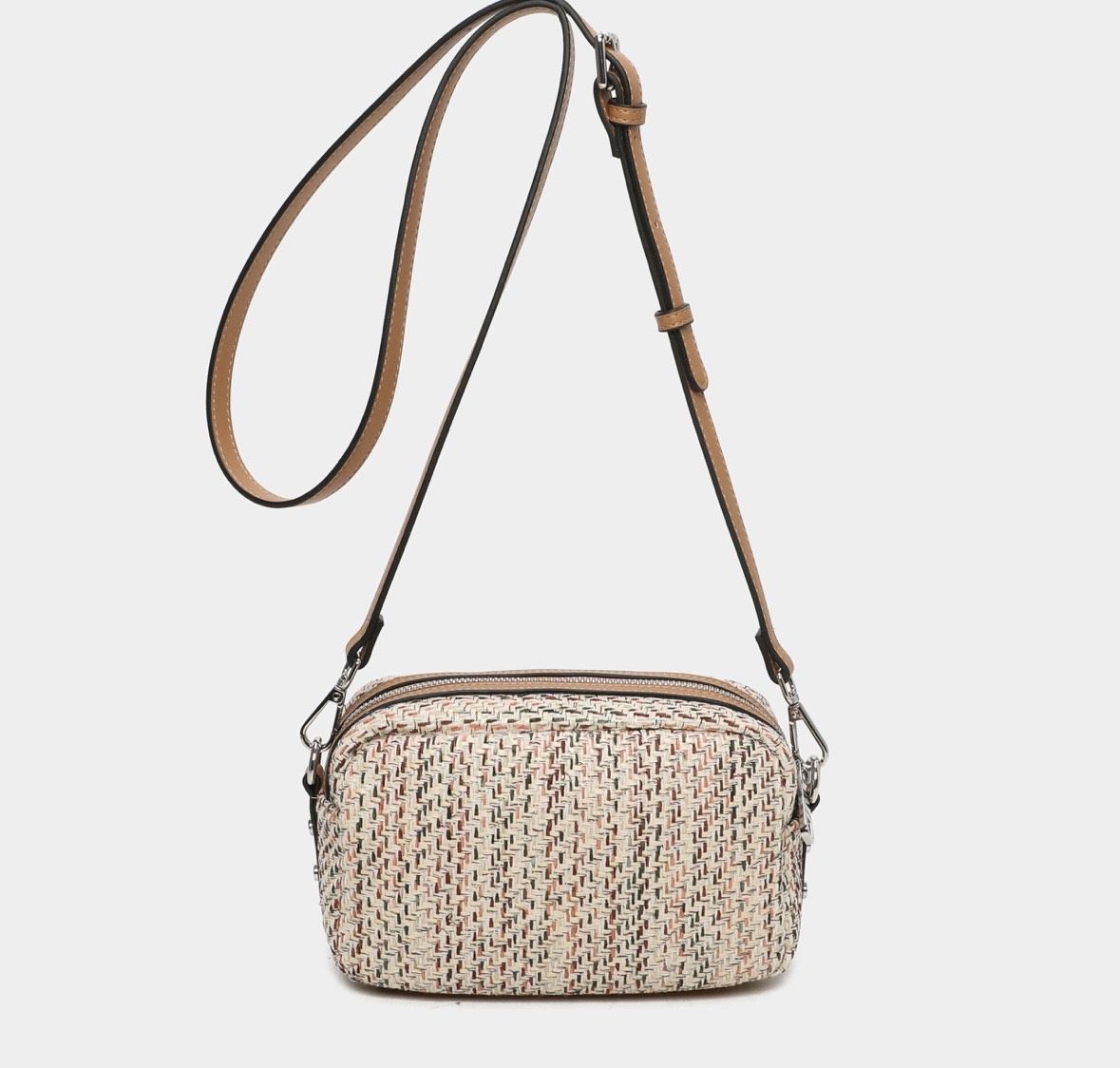 Bandolera de tamaño pequeño pero con gran capacidad de la colección de Binnari modelo Jucar es el correcto. Confeccionado en rafia textil, su asa es ajustable. Dos compartimentos interiores, uno de ellos con cremallera. ¡Top ventas!