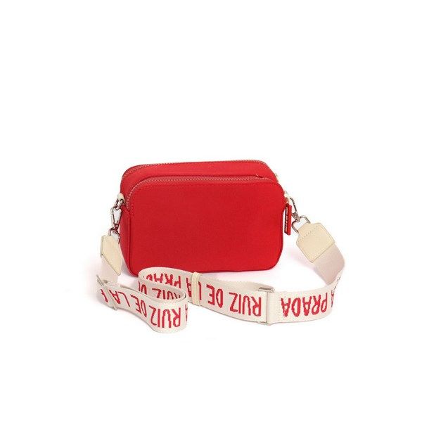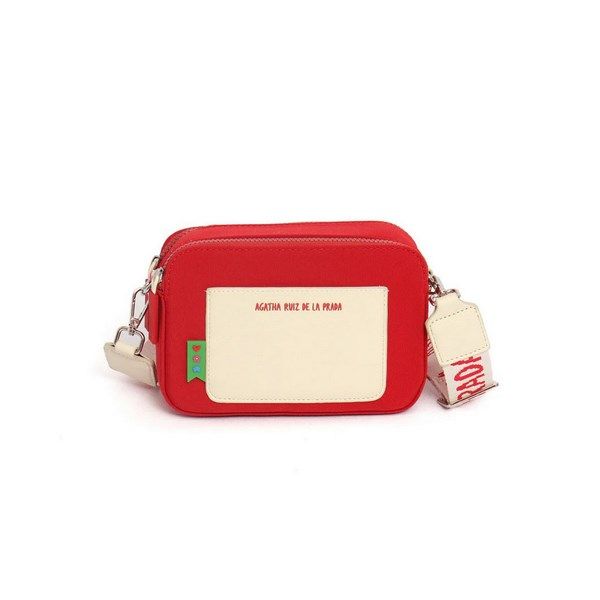 Bolso bandolera de loneta de color rojo y blanco de la colección de Agatha Ruiz de la Prada. Cierres de cremalleras y bandolera regulable.