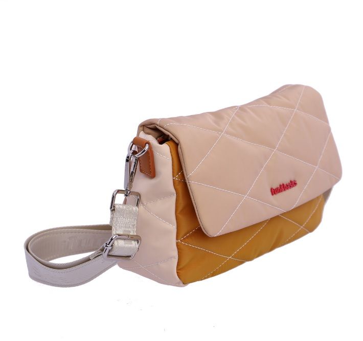 Bolso bandolera para mujer de nylon, con asa bandolera ajustable con logos de la colección de Fun and Basics. Tiene cierre de cremallera y solapa, dispone de tres bolsillos interiores, dos delante y uno detrás con cremallera, más otro exterior detrás también con cremallera. El bolso esta confeccionado en nylon de tres colores pasteles con pespuntes de rombos en color blanco, lleva el logo metálico de la marca en color rojo y combina a la perfección, los tiradores van personalizados. Interior de poliéster.