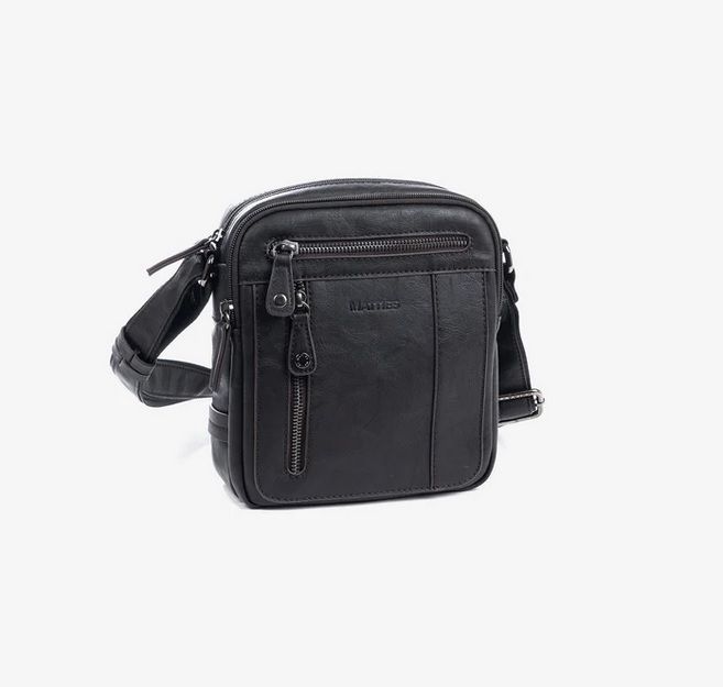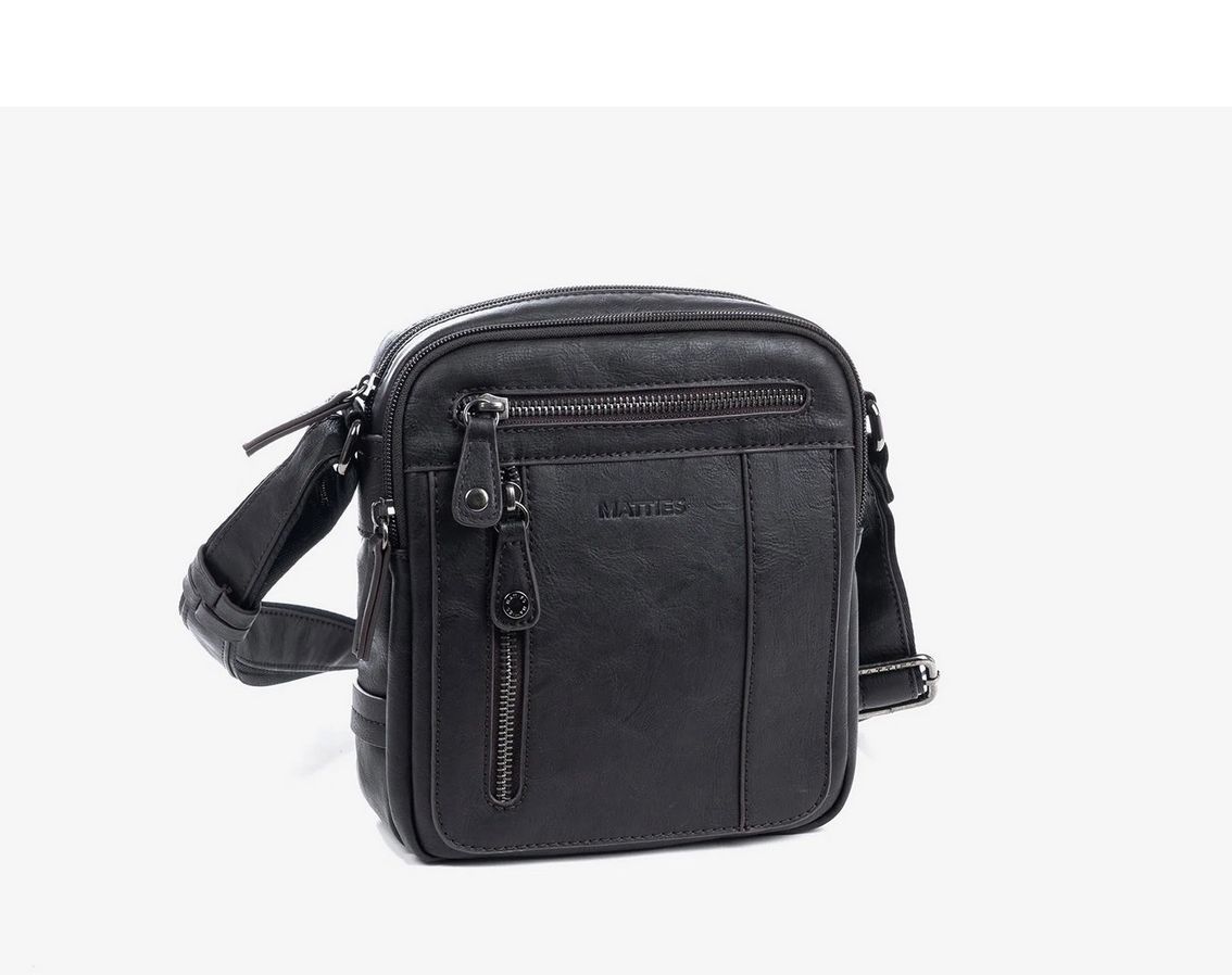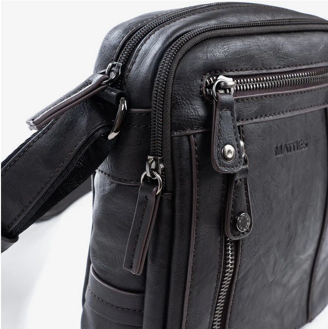 Bolso bandolera para hombre de la colección de Matties Bags. Bolso fabricado en polipiel de alta calidad, interior de forro textil con un bolsillo cerrado con cremallera. En la parte trasera tiene un bolsillo cerrado con cremallera. Asas con corredera para su fácil ajuste.