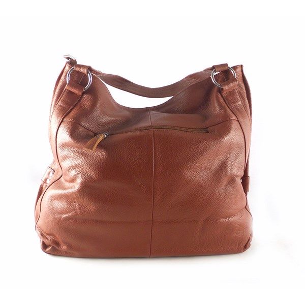 Bolso tipo shopper diseñado y fabricado en España. Bolso de piel vacuno natural hidratada veteada y suave. Cierre de cremallera. Doble asa de hombro con detalle de anillas plateadas.