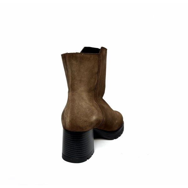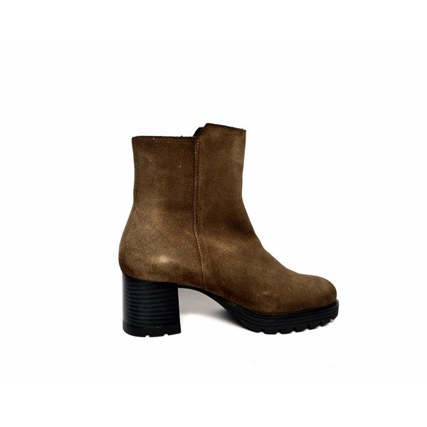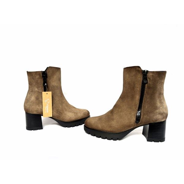 Botines para mujer con tacón de la colección de Viguera modelo vitelo en color sander. Botines fabricados en piel vacuno natural hidratada y flexible con textura antelina. Cierre de cremallera. Tacón de 6 cm con piso de 2 cm dentado engomado antideslizante. Planta acolchada en piel. Botines muy ligeros y ergonómicos.