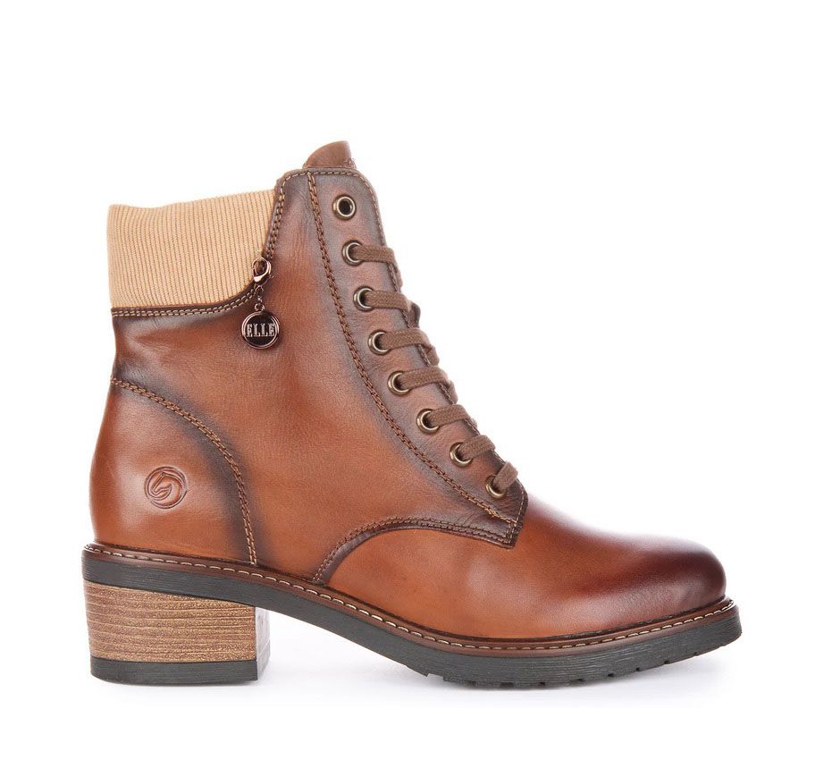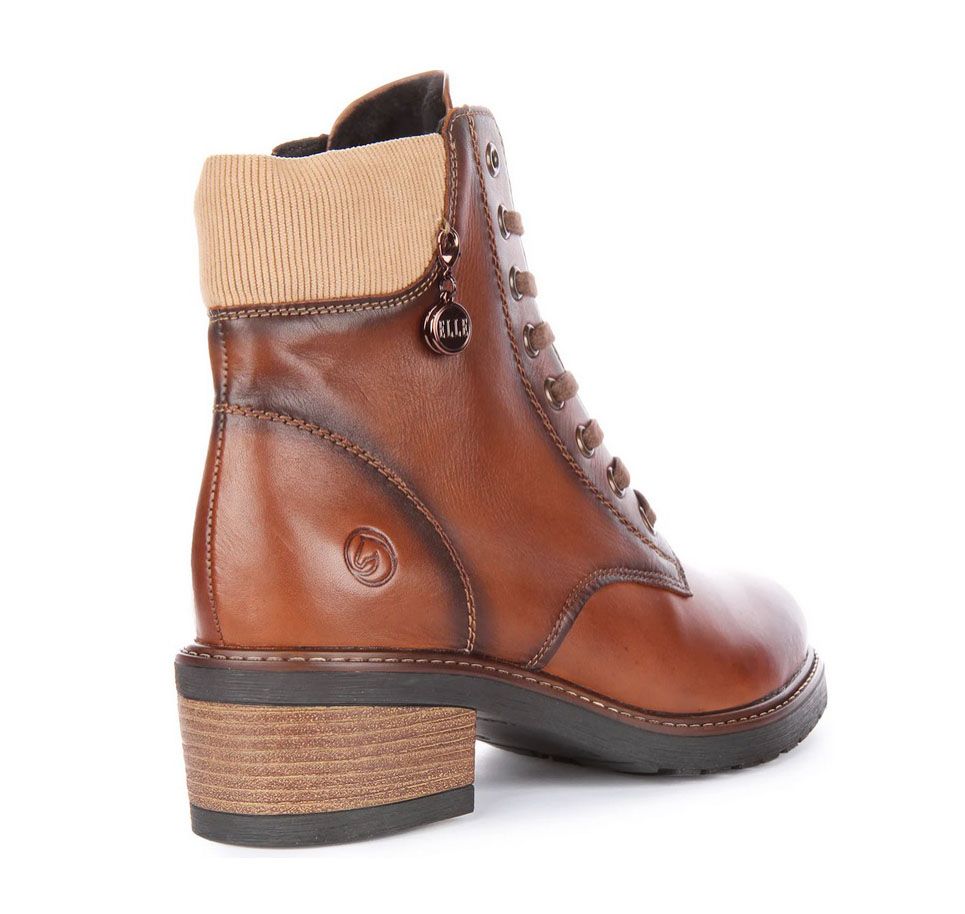 Botines para mujer de la colección de REMONTE para Elle en color cuero. Botines de piel suave con cierre de cremallera con detalle de pana actual. Plantilla anatómica intercambiabl. Cordones y práctico cierre de cremallera. Suela de goma flexible con amortiguación de la pisada y tacón de bloque. Ancho G.