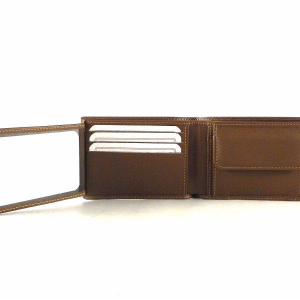 Cartera para hombre de la colección de Nilo. Piel vacuno natural hidratada y flexible. Forma horizontal. Cierre de broche. Monedero interior con doble billetero y 7 tarjeteros.