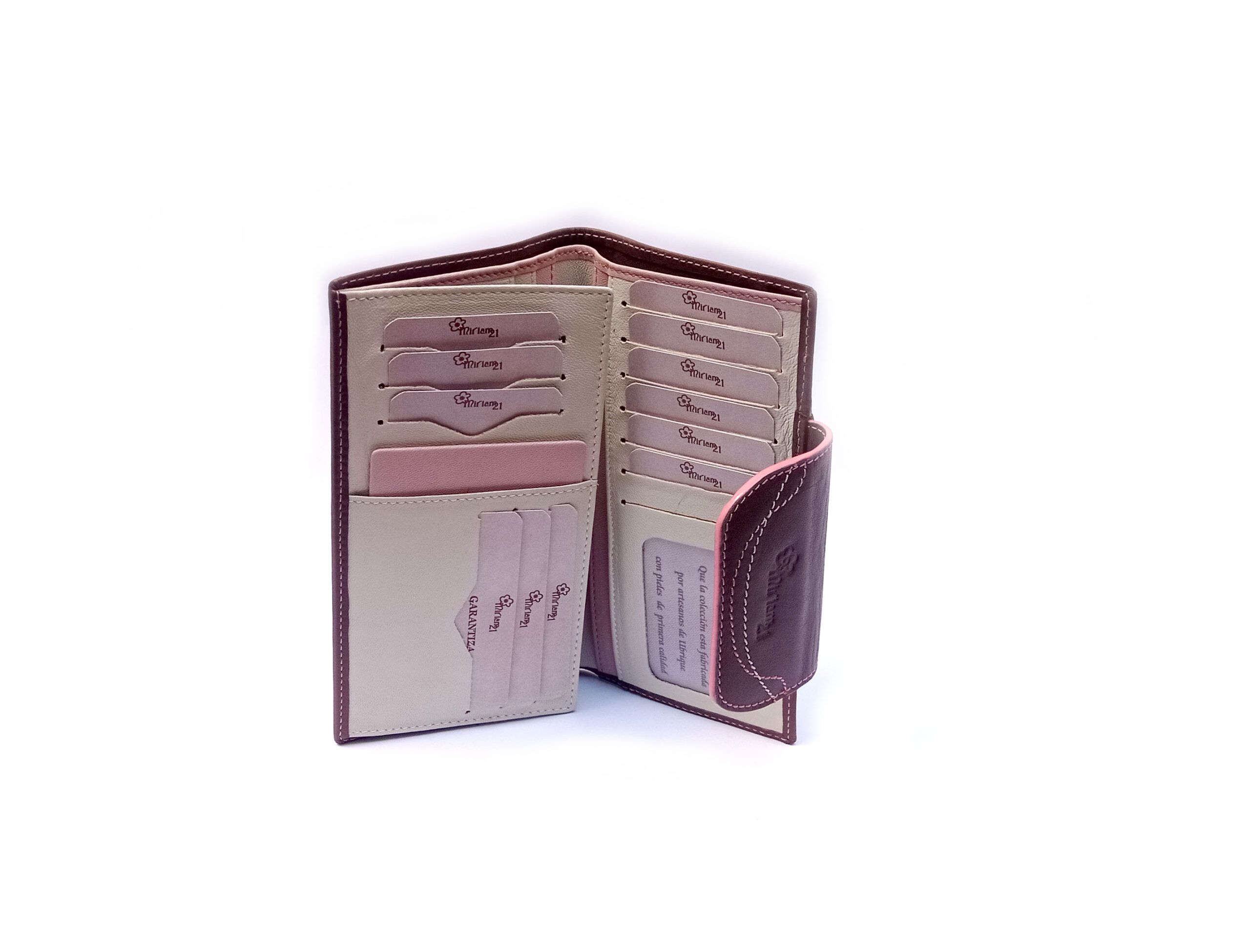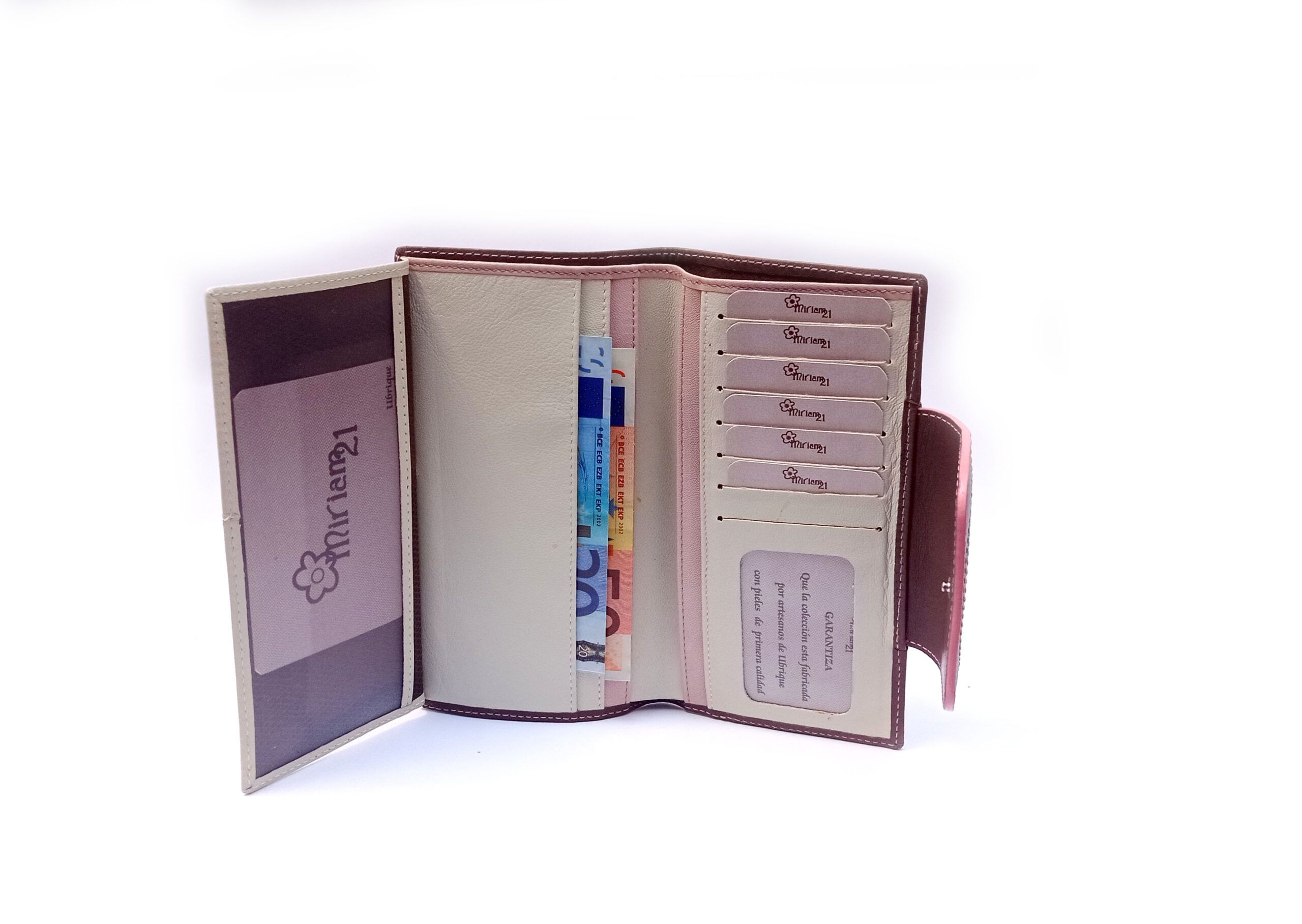 Cartera billetera para mujer de tamaño grande de la colección de Nilo. Cartera con 14 ranuras para tarjetas y 6 ranuras para billetes. Monedero de cierre de cremallera. Cartera en piel vacuno de alta calidad suave e hidratada. Medidas: 18 x 9,5 cm.