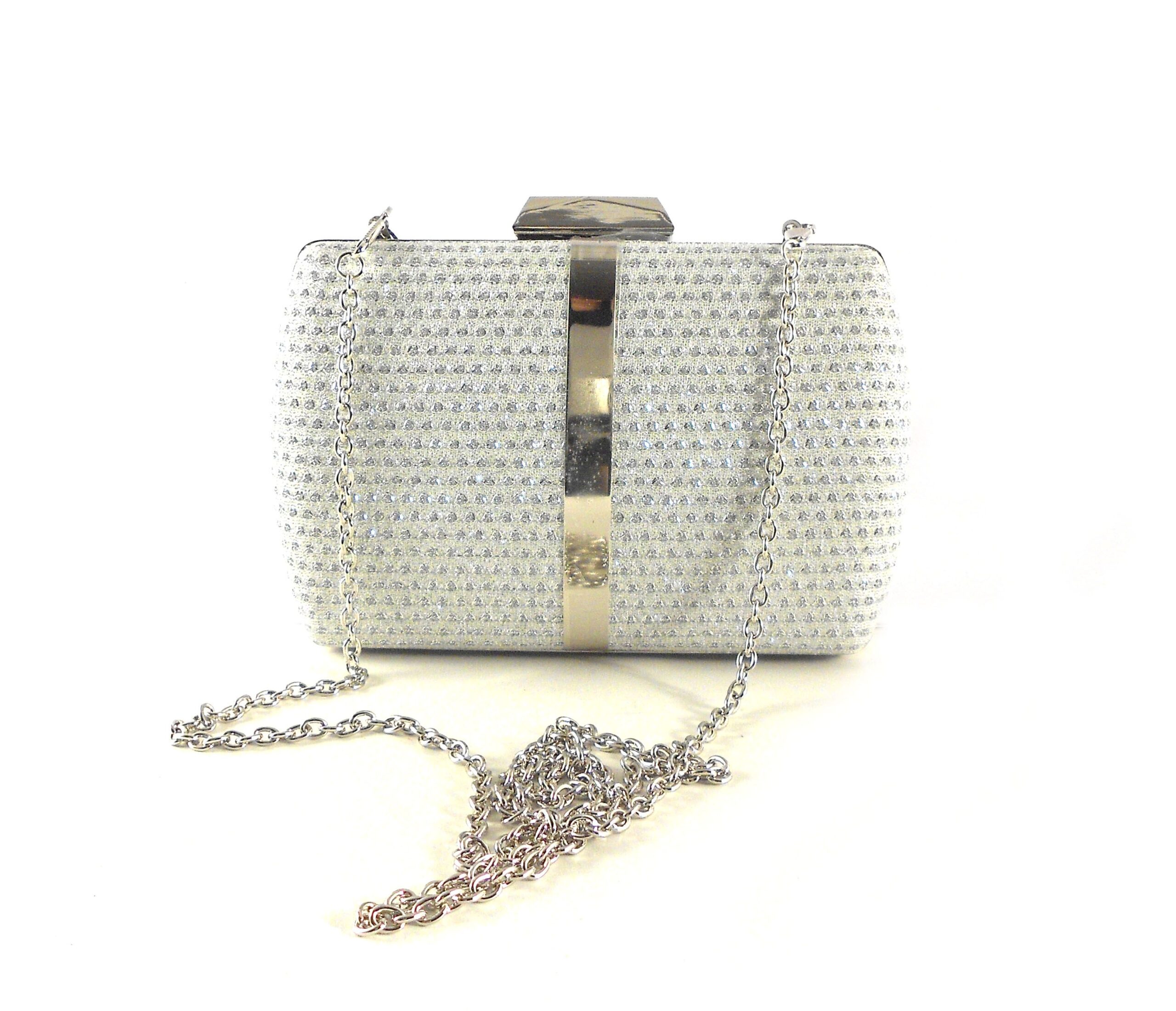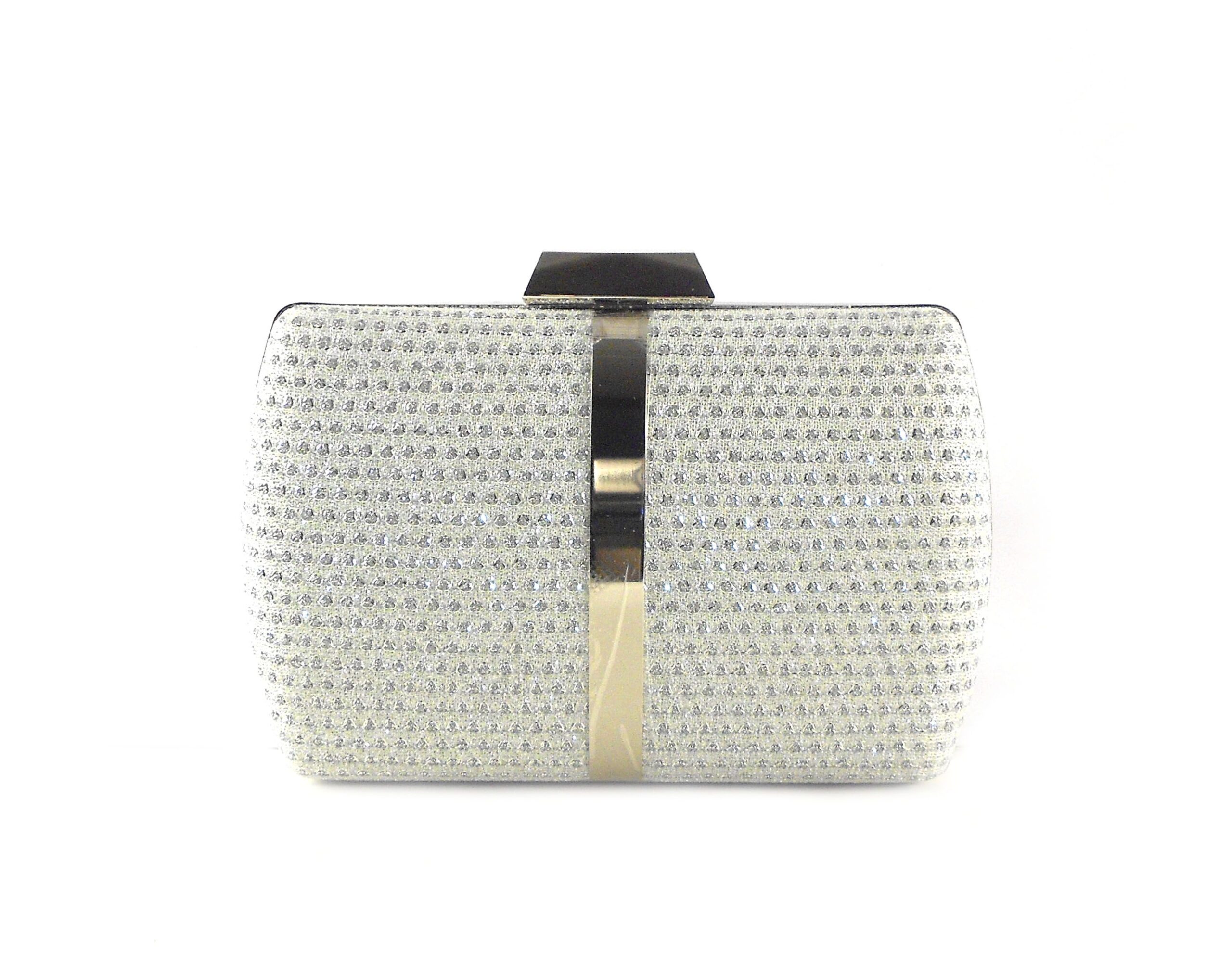 Bolso de fiesta tipo clutch de la colección de E.Ferri. Clucth rígido de mano con bandolera de cadena en color plata. Cierre metálico.