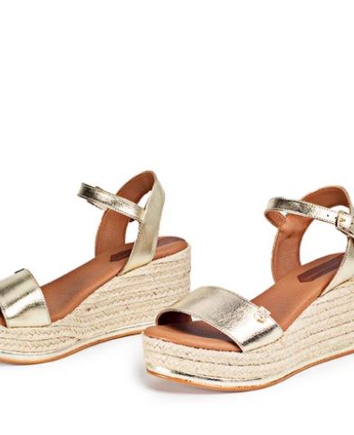 Sandalias de cuña baja de yute de la colección de POPA modelo Arambol en laminado color platino con cierre de hebilla en pulsera al tobillo. Planta en piel acolchada.