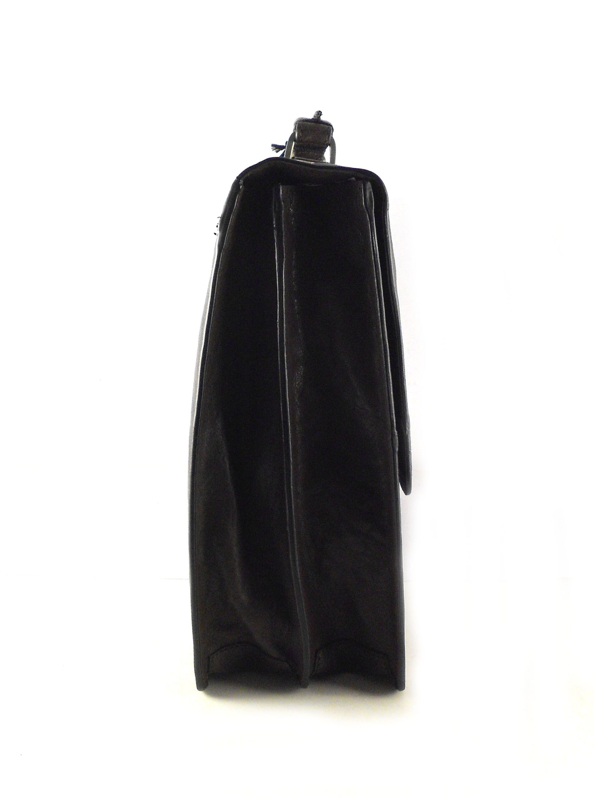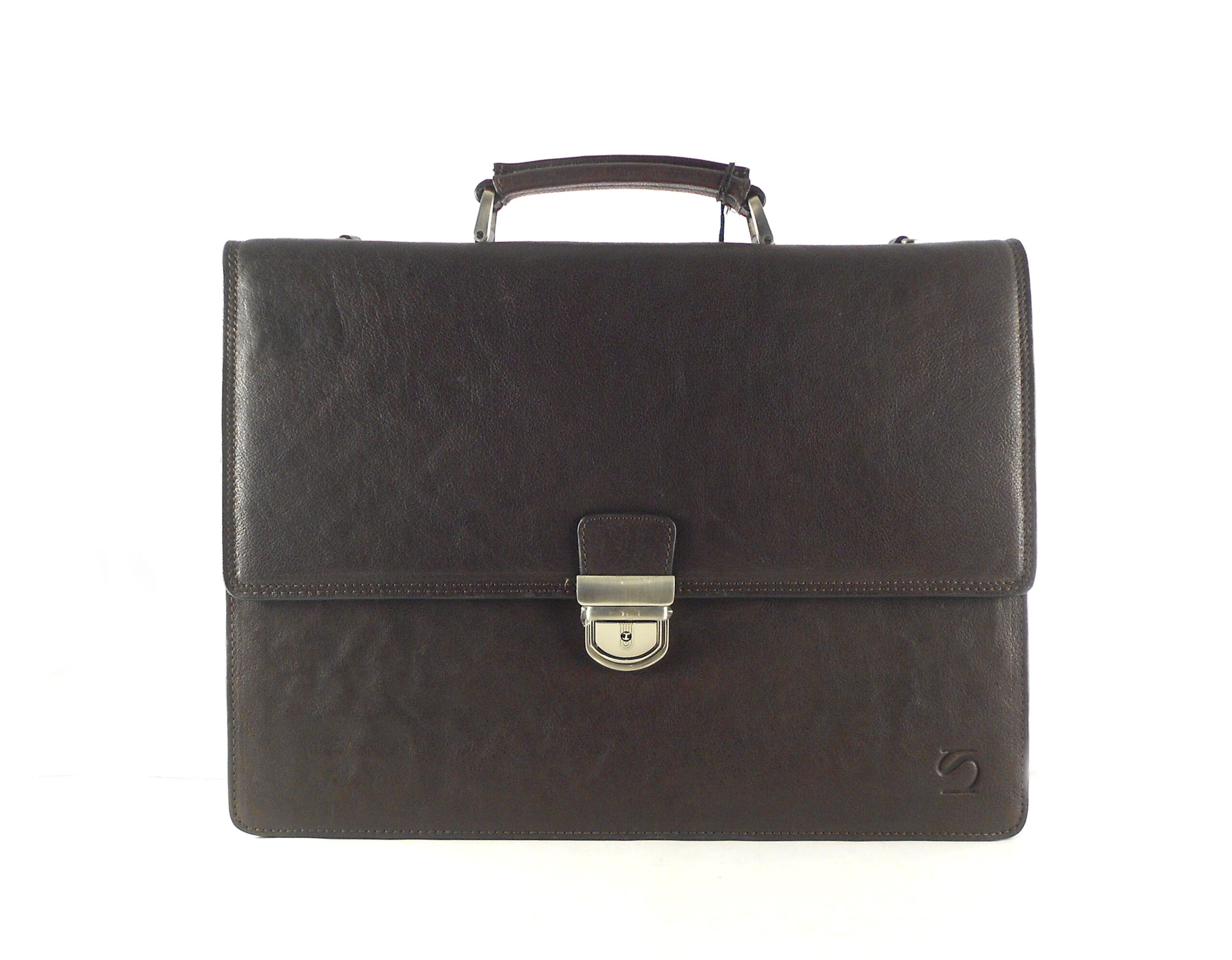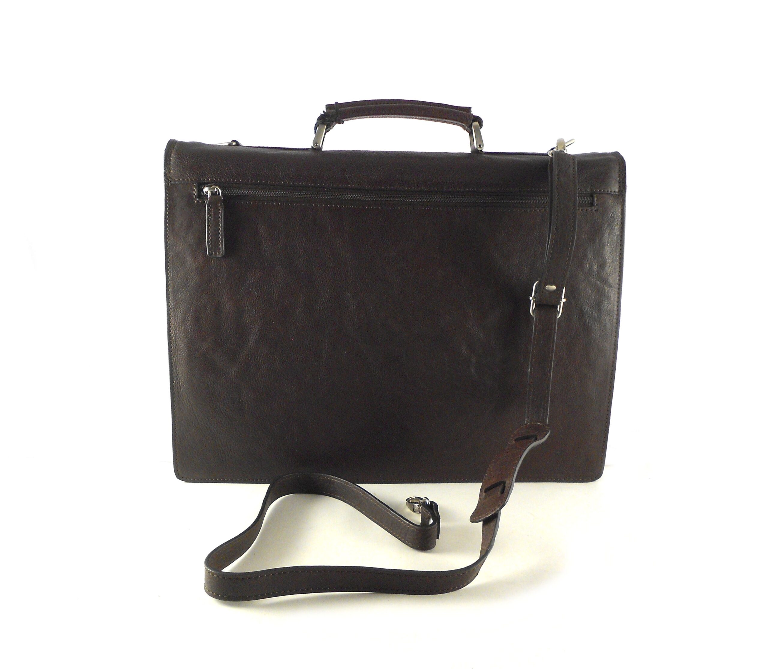 Maletín con dos departamentos principales separados por otro con cierre de cremallera. Organizador bajo solapa media. Cierre metálico de clic con llave de seguridad. Color único disponible marrón oscuro.