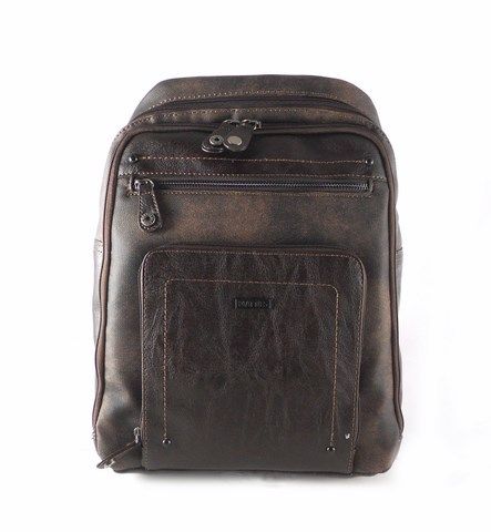 Mochila fabricada en sintético piel combinado con textil graso. Asa de mano con tirantes regulables. Disponible en color marrón y negro.
