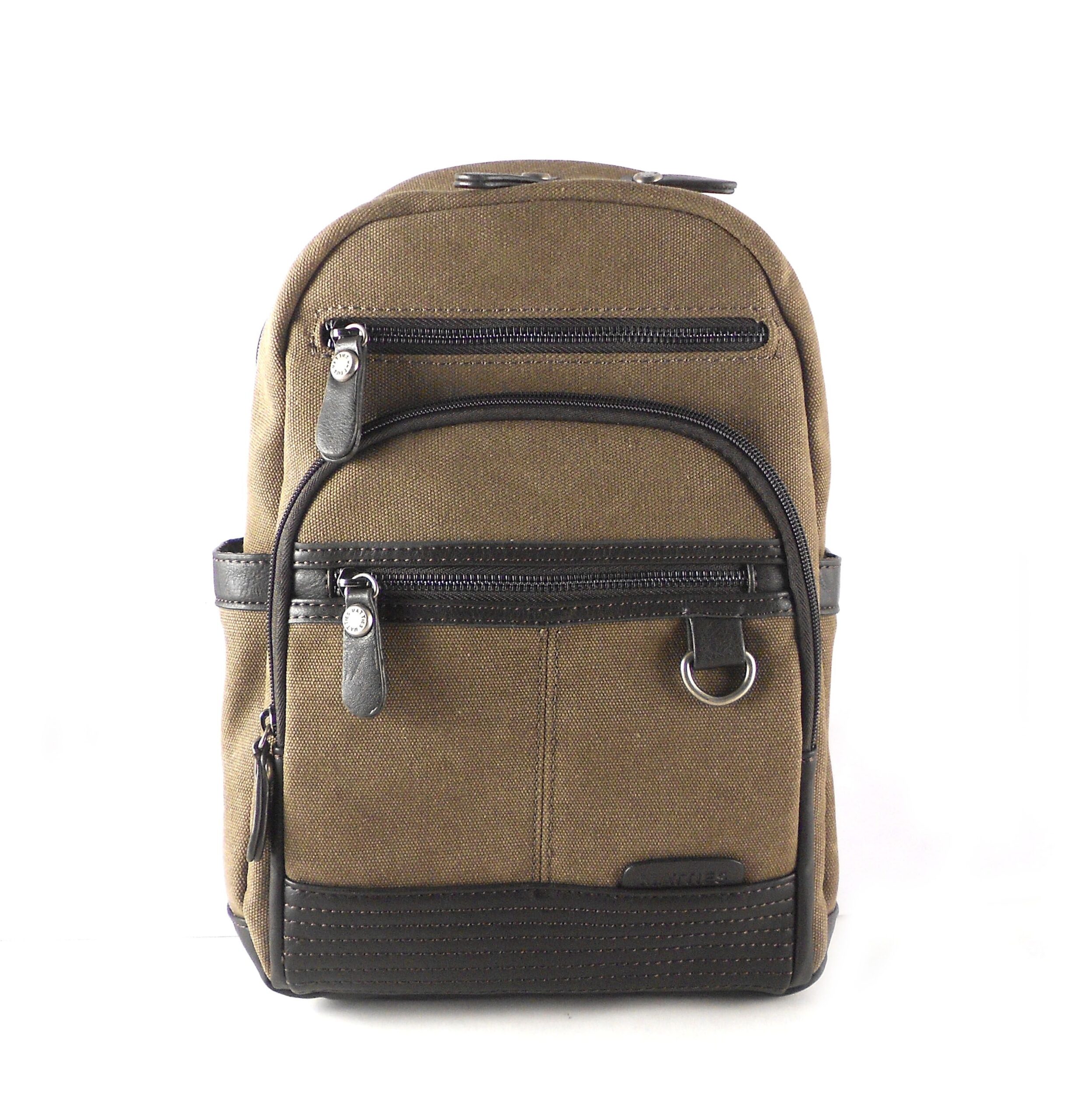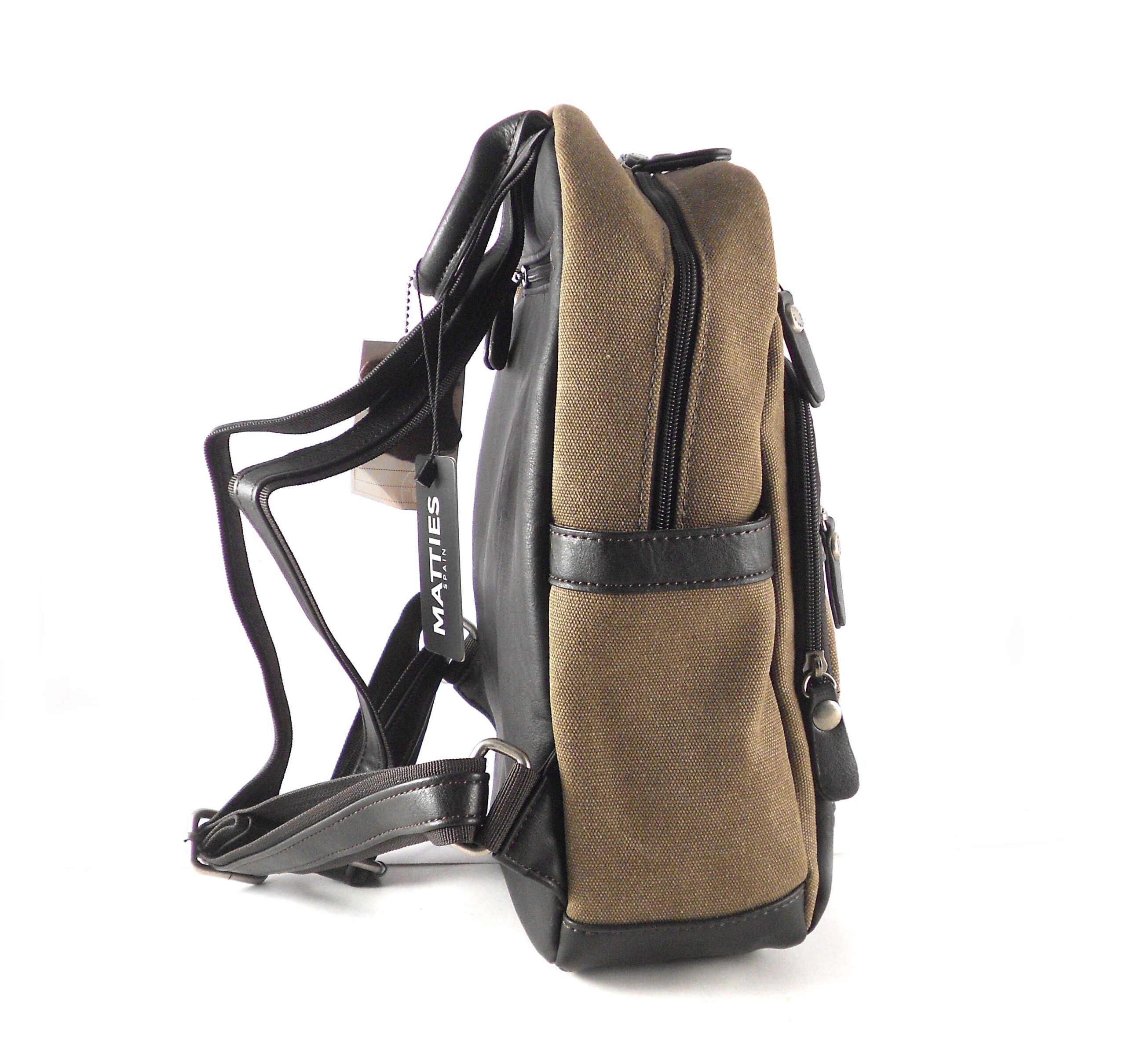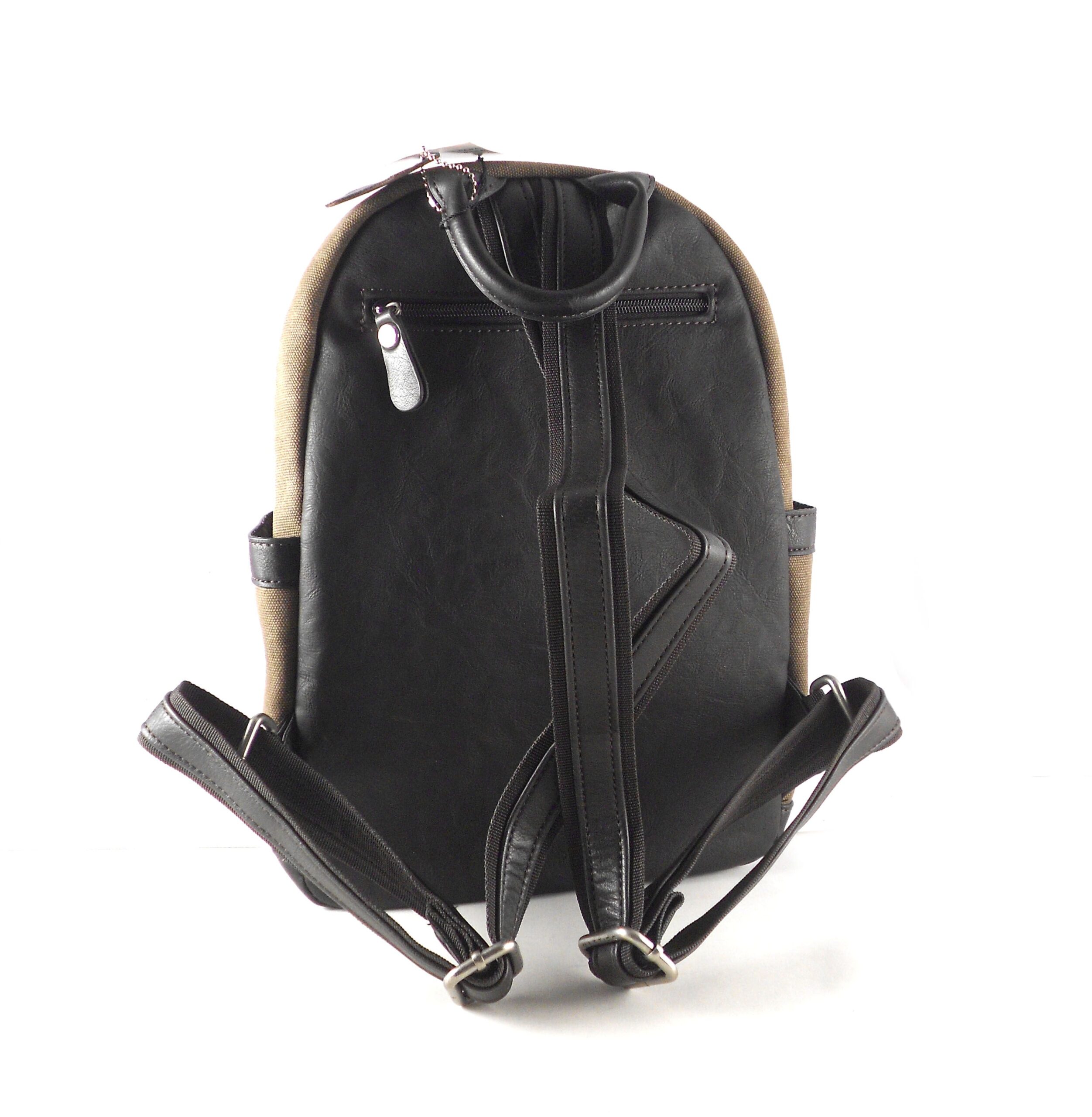 Mochila fabricada en sintético piel combinado con textil. Color único marrón.