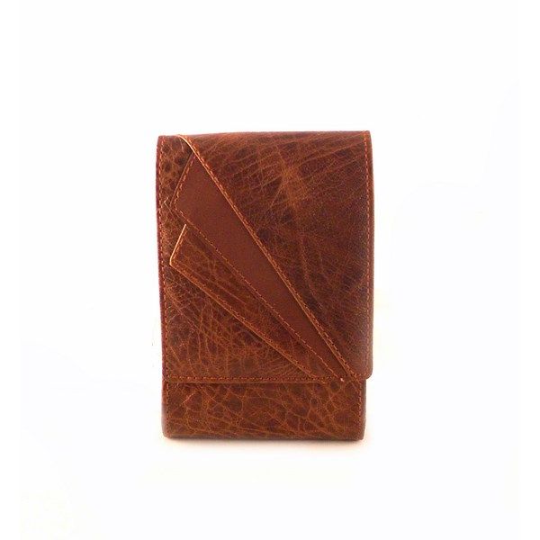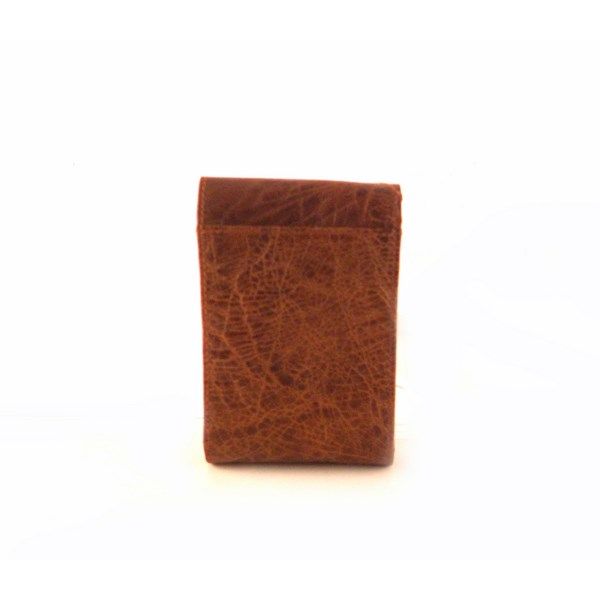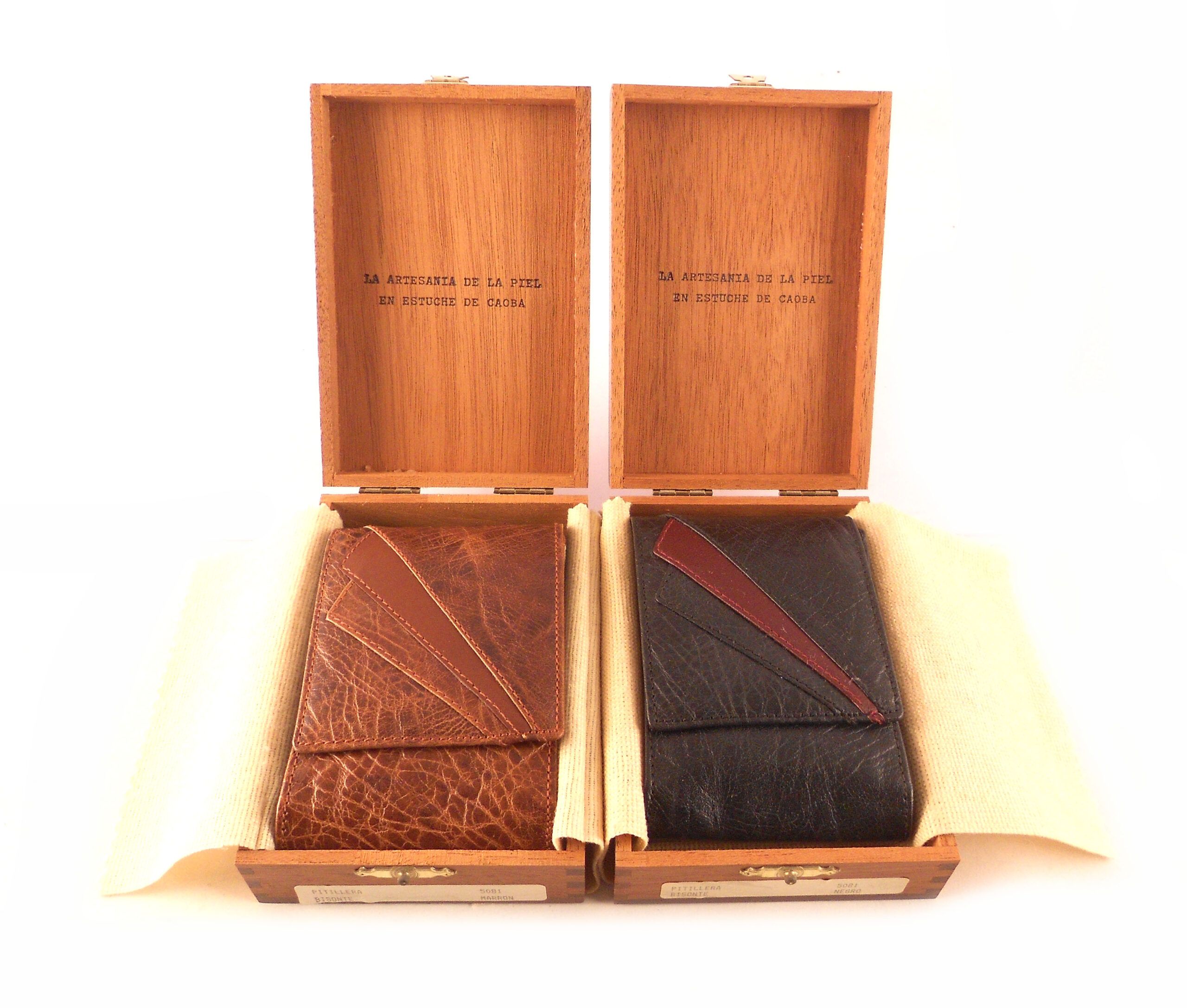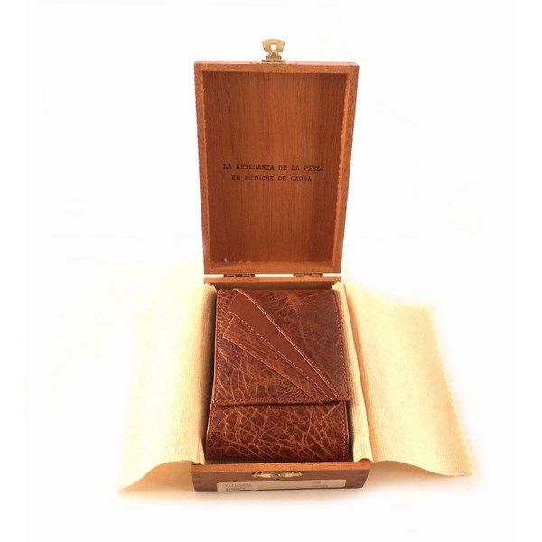 Pitillera de la colección de Marroquinería Nilo. Pitillera con cierre de solapa y ranura para tarjeta trasera. Piel vacuno natural hidratada y flexible. Detalle de caja de madera.