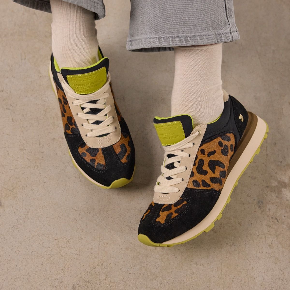 Sneakers para mujer de la colección de GIOSEPPO de estampado leopardo modelo VOLNEY. Estas sneakers aportan fuerza a tus looks con el animal print. Sneakers estampado de leopardo con acentos en color lima. Cuentan con plantilla anatómica y extraíble, entresuela de EVA y patín dentado.