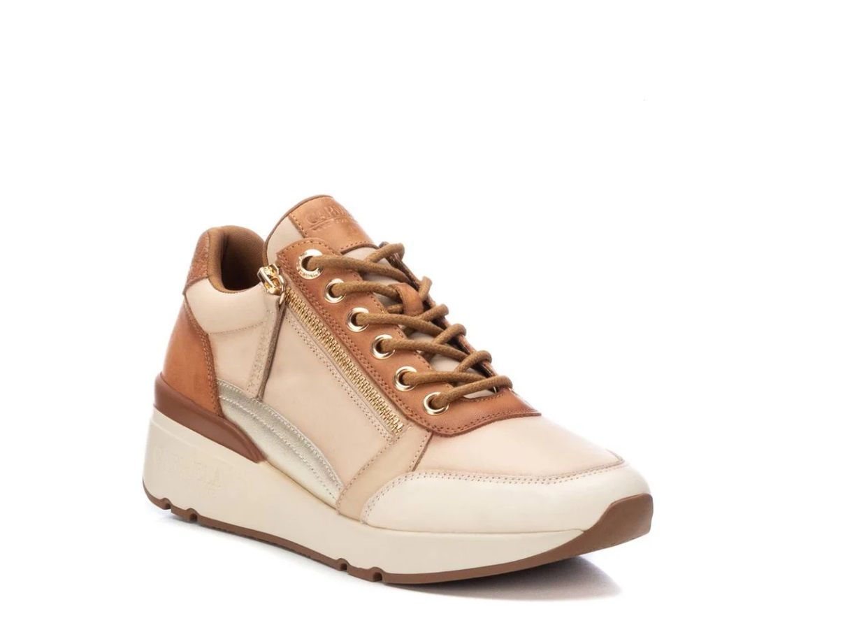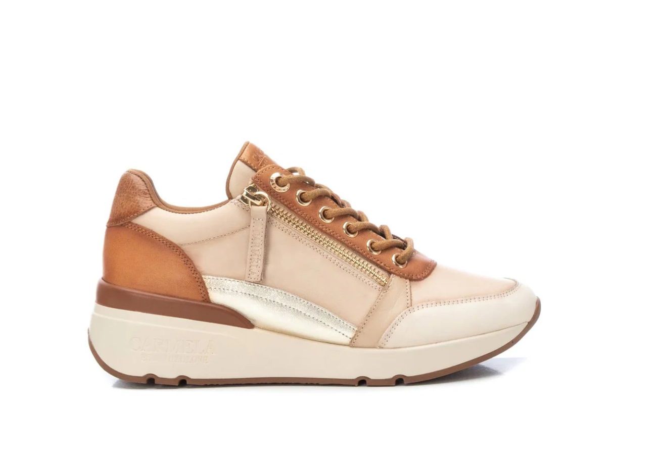 Zapatilla de mujer, de la marca Carmela. Fabricada en piel de alta calidad. Cierre mediante cremallera lateral y cordones ajustables. Piso volumen con suela de goma antideslizante