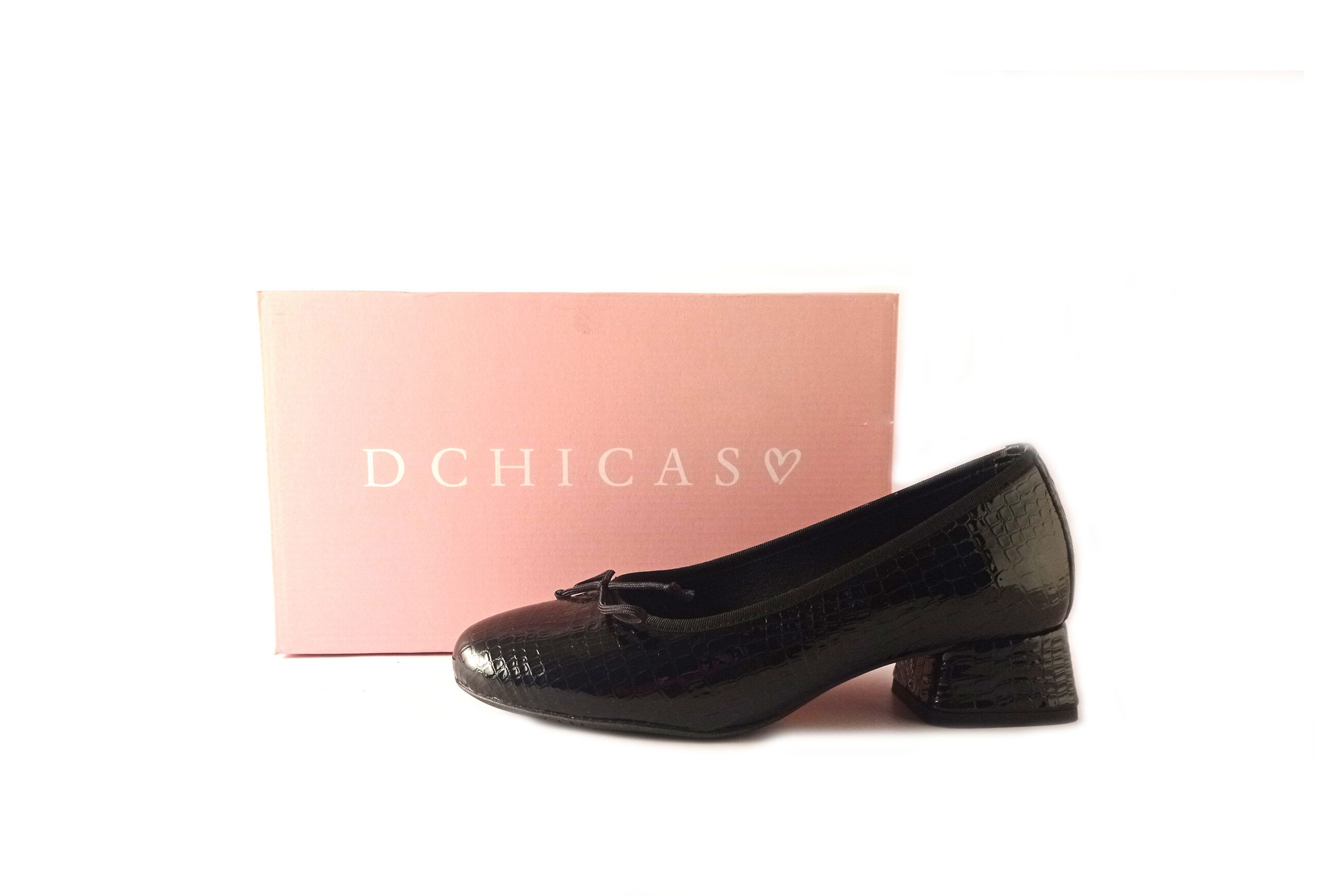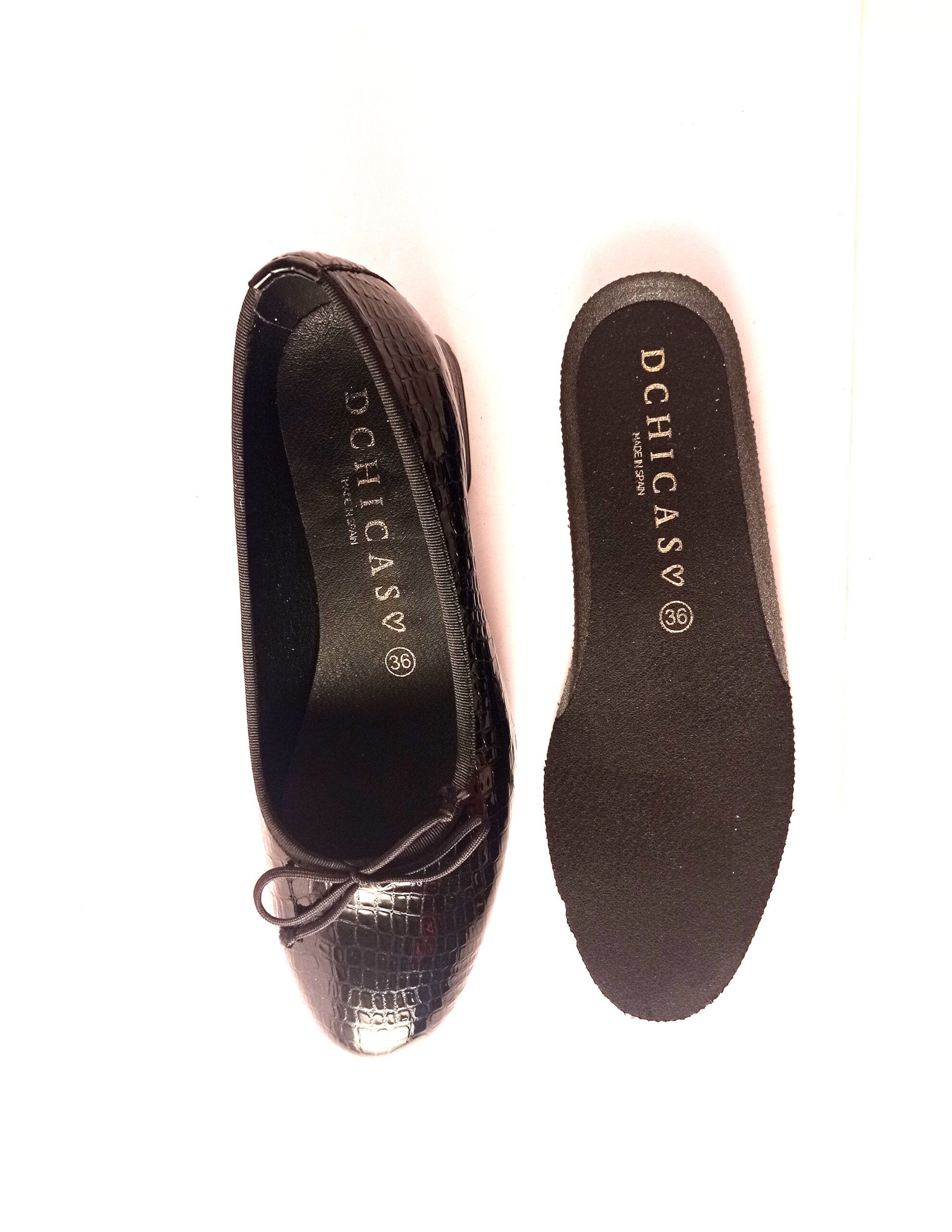Zapato bailarina D’Chicas de tacón bajo en piel grabada color negro.