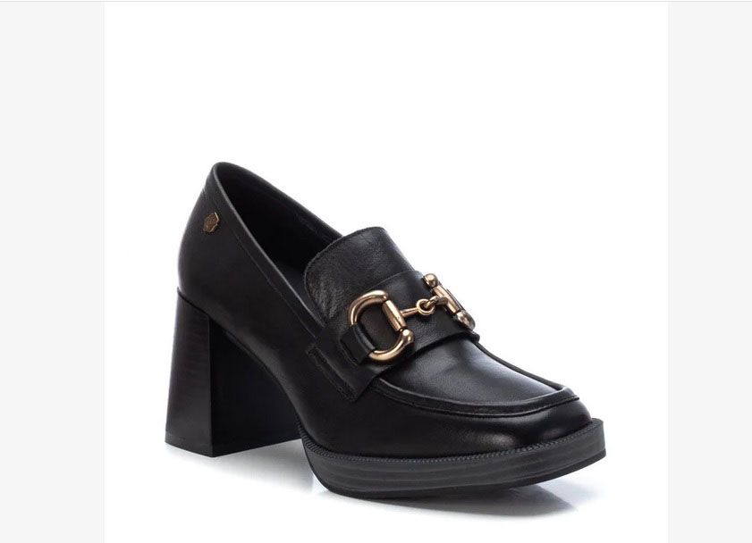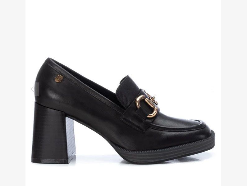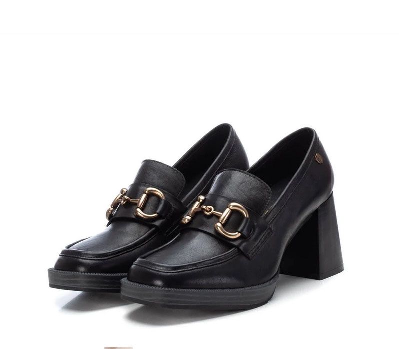 Zapatos para mujer tipo mocasín de mujer de la marca Carmela. Zapatos fabricados en piel de alta calidad. Modelo estilo clásico con antifaz y detalle metálico decorativo. Tacón ancho de 8 cm y plataforma para mayor comodidad. Suela antideslizante.