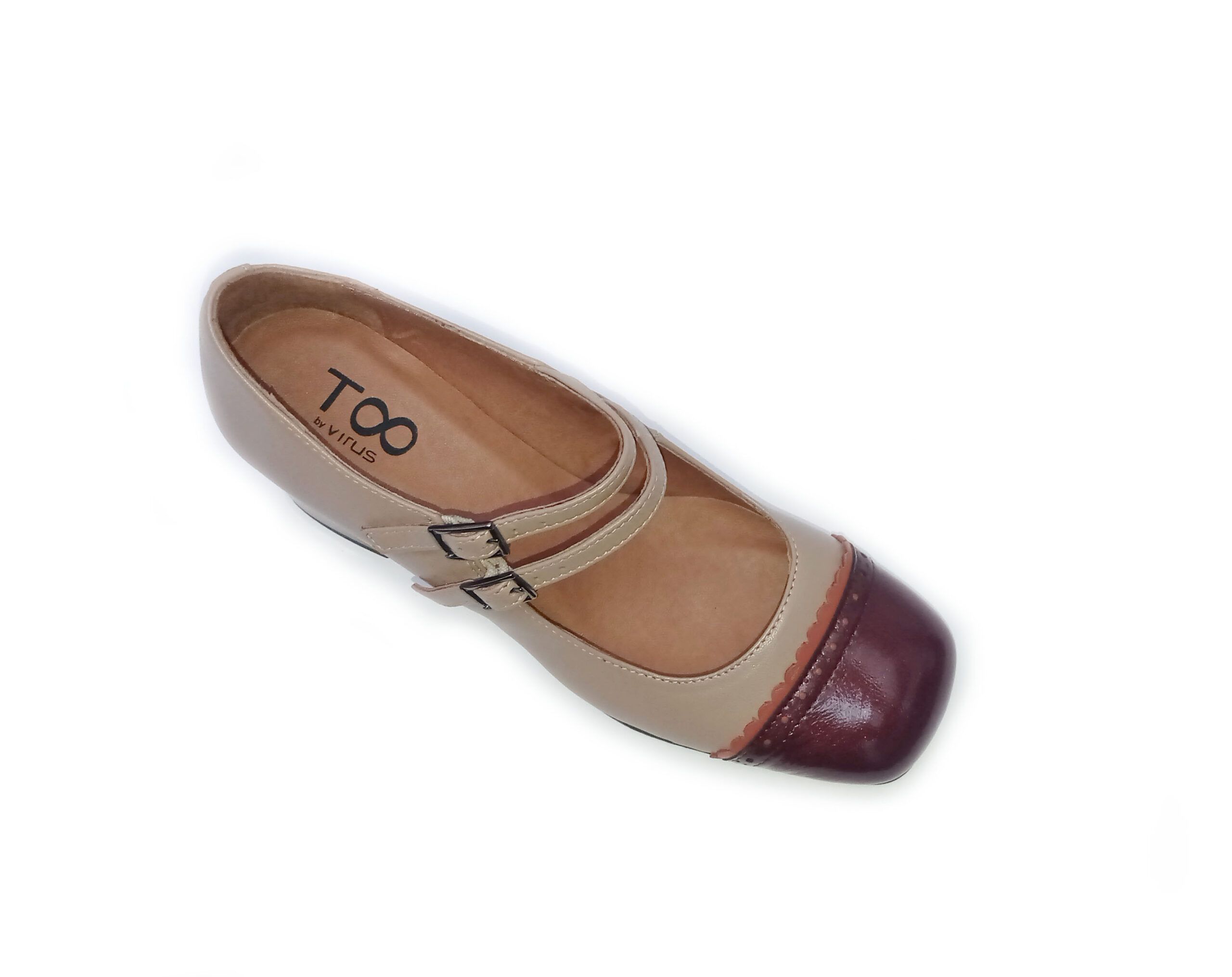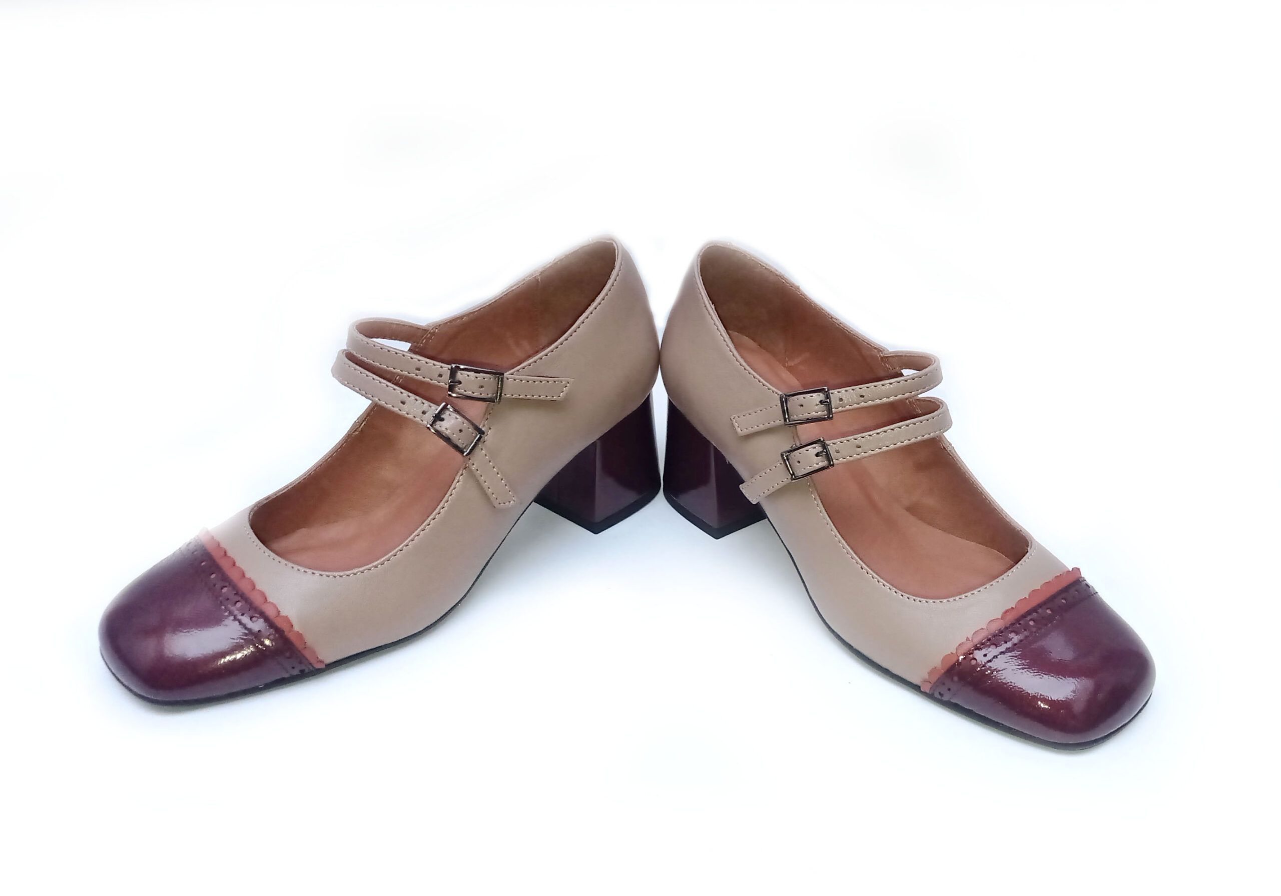 Zapatos para mujer de tacón de la colección de T Infinito by VIRUS. Zapatos de diseño con cierre de doble pulsera y puntera cuadrada. Tacón forrado de 5,5 cm. Planta acolchada. Zapatos fabricados en Portugal en piel vacuno natural hidratada y flexible de 1ª calidad.