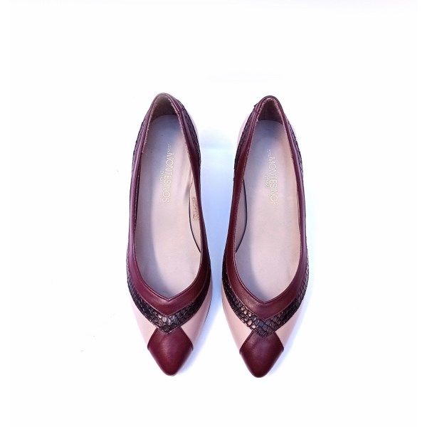 Zapatos salón J. Montesinos en piel rosa nude con burdeos de la colección de continuidad de la marca.